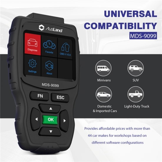 AUSLAND MDS-9099 automotive service tools provides affordable prices with more than 44 car makes for workshops base on different software configurations. It support multi languages and online update.